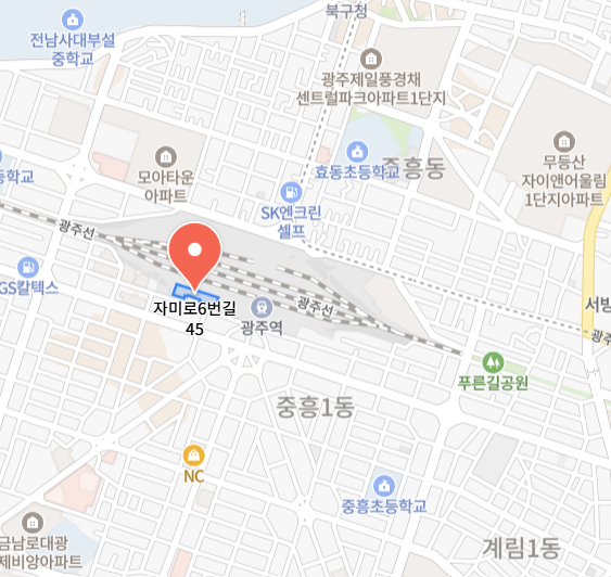 - 버스: 01, 07, 지원25, 518번 버스 이용, 광주역 또는 NC백화점 하차 (도보 5분)